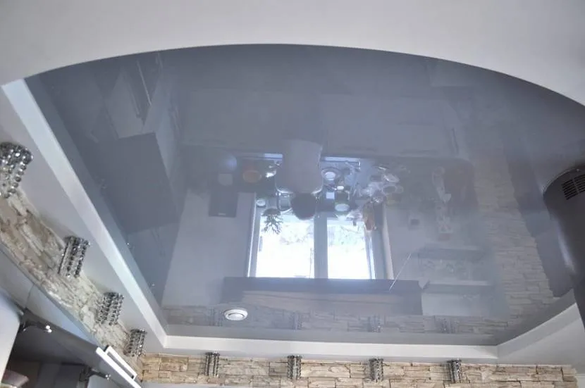 - Для многих очень важен простор, именно серый глянцевый потолок способен прекрасно визуально увеличить пространство помещения.
