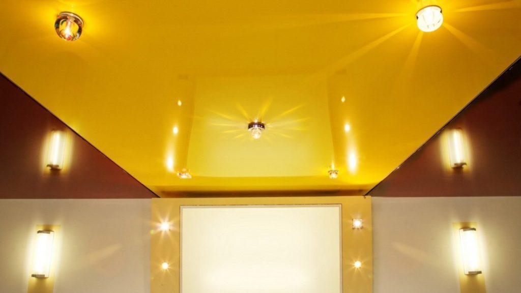 В натяжных потолочных конструкциях часто устанавливают встроенные светильники.