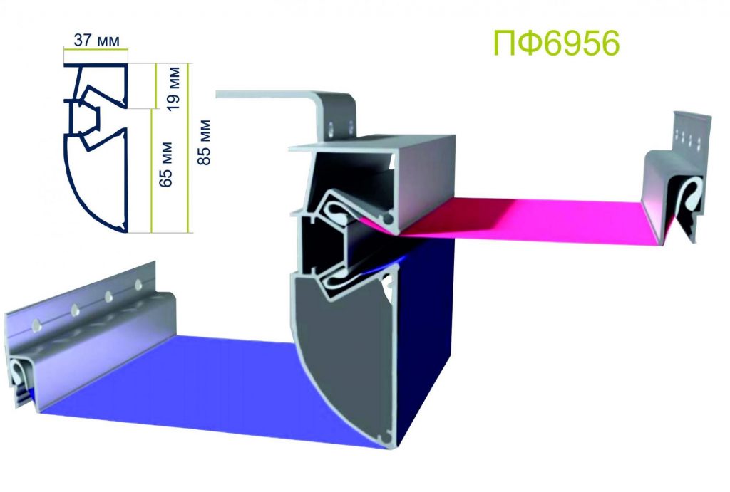Принципиальное устройство довольно простое. Основных элементов два: полотно и профиль с креплением (багет). Вид каждого из них подбирается под конкретные условия. Профили делают из пластика или алюминия.
