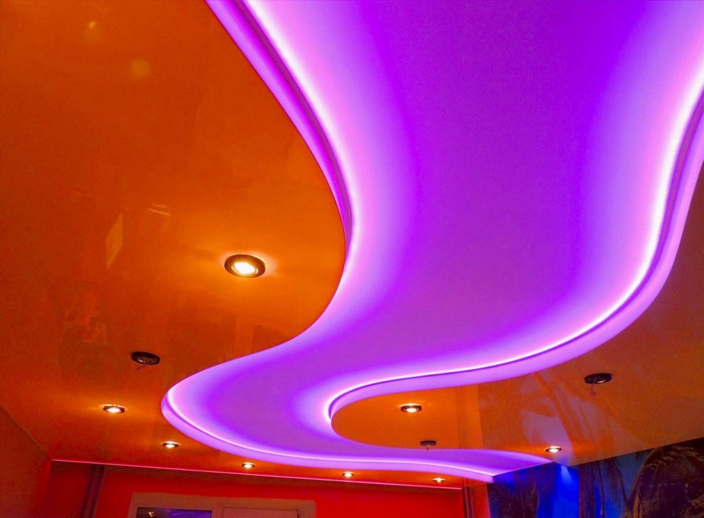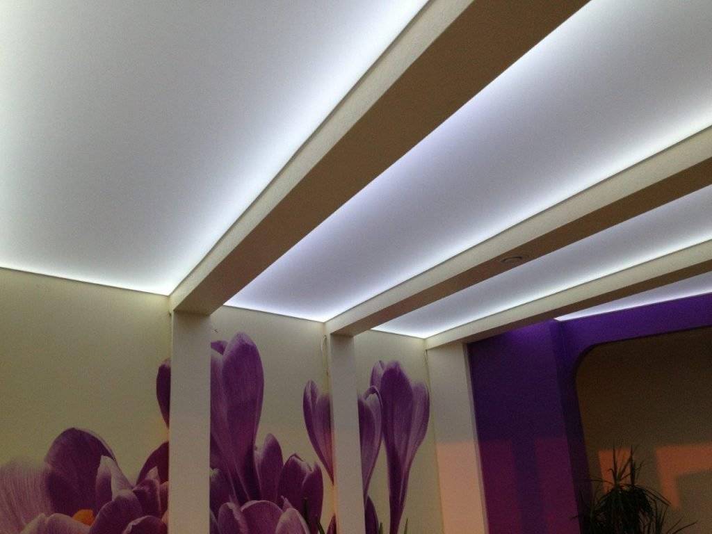 Для мягкого романтического и загадочного свечения по периметру конструкции потолка, можно воспользоваться светодиодной ленточной подсветкой.