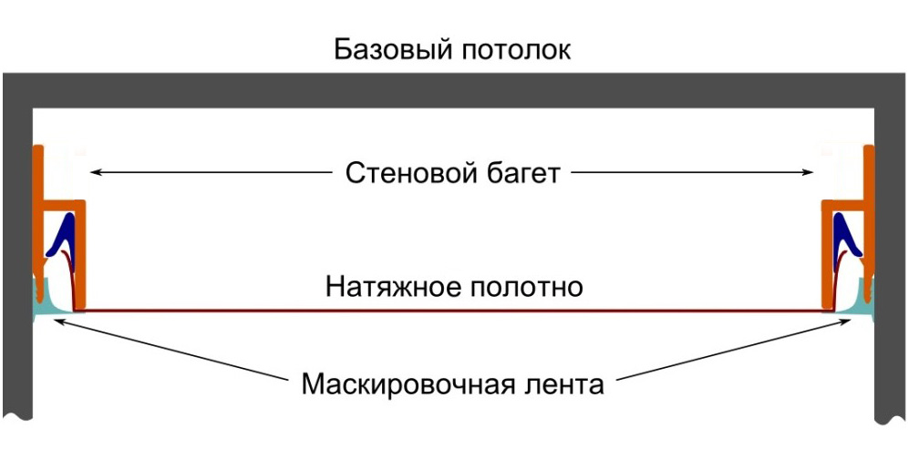 Между багетами натягивается и закрепляется полотно. Черновой потолок после монтажа не виден. Поэтому подготовка основания не требуется. Скрываются неровности, а при необходимости — инженерные системы и коммуникации.