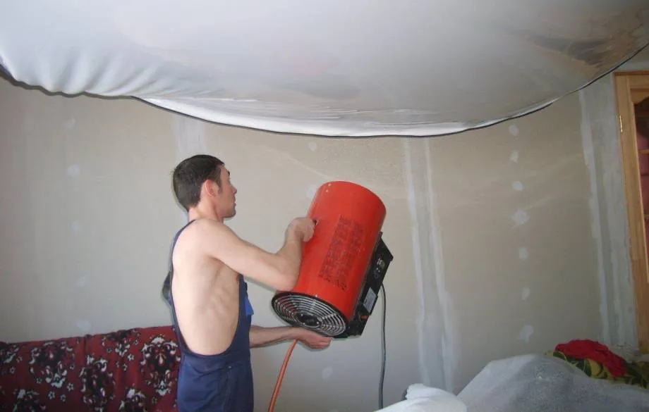 Для первого варианта нужен нагрев до 60-70°C, для этого применяется тепловая пушка. Только так можно натянуть полотно и получить ровное покрытие. Как правило, используется газовая пушка, редко — электрическая.