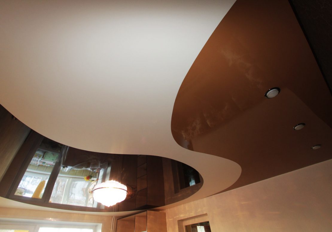 Двухцветные натяжные потолки могут отличаться своей конструкцией. Проще всего изготовить одноуровневые покрытия с полотном, которое выполнено из пленки двух цветов. Во втором случае двухцветный потолок получается при изготовлении двухярусной конструкции, каждый ярус которой подшивается пленкой разного цвета. Чтобы сделать одноуровневый двухцветный натяжной потолок, два полотнища разной расцветки нужно сварить.
