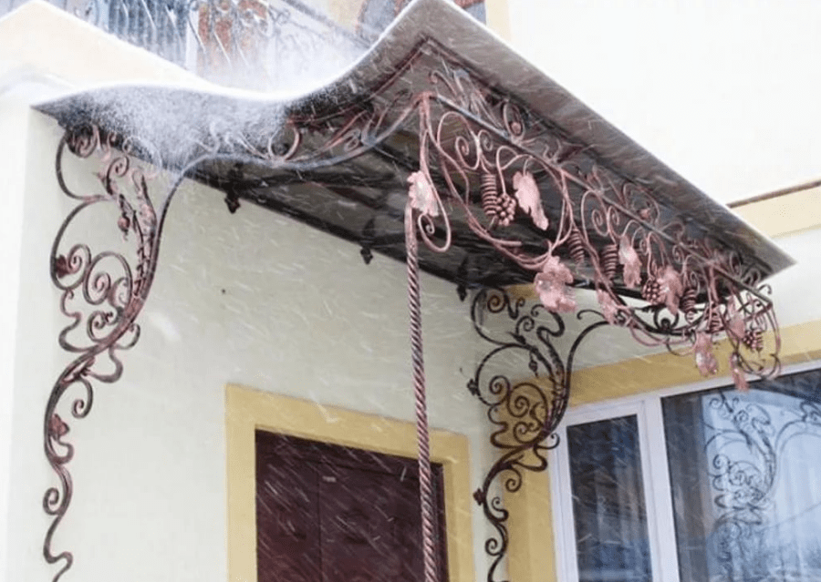 При выборе обращайте внимание именно на отток осадков. Хороший кованый козырек на крыльцо не накапливает их, а наоборот – обеспечивает постоянный отток. Козырьки также делятся на два типа по материалу производства