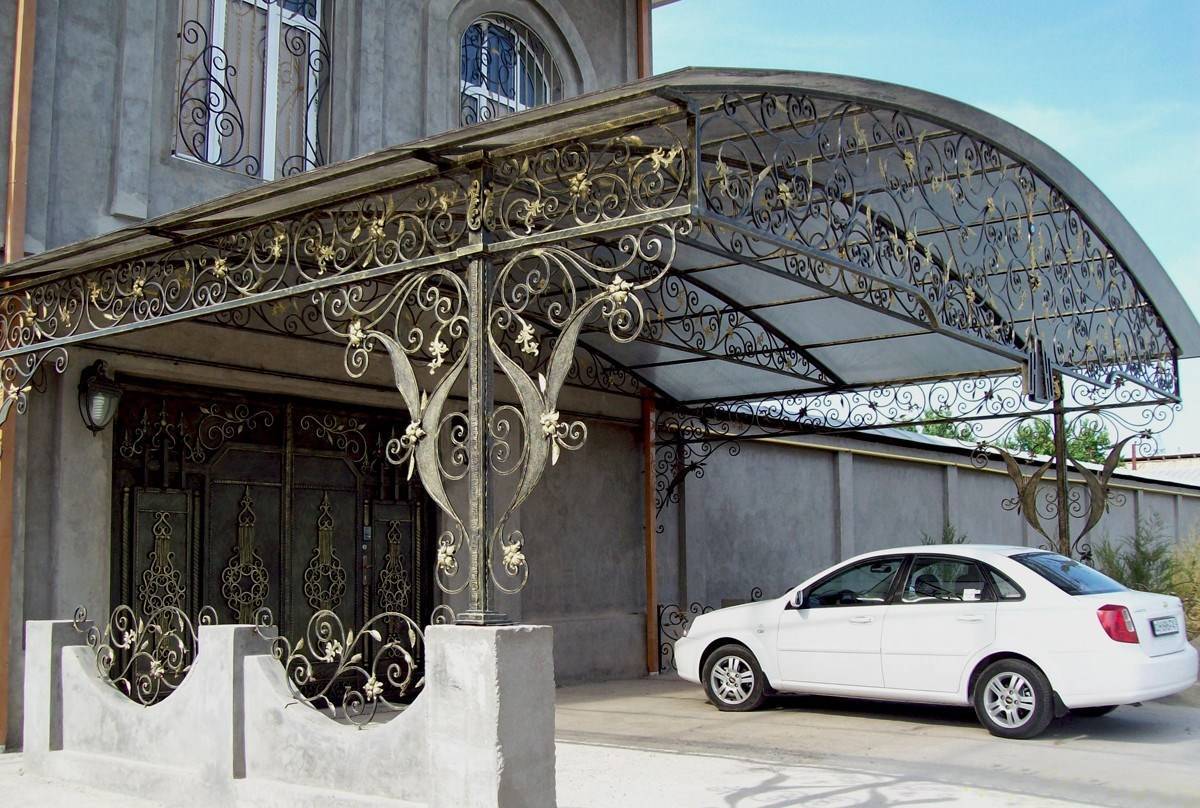 Каркас навесного сооружения можно построить из металла или дерева. Для этого используются алюминиевые или стальные профили, а также кованые детали. Кованый каркас дорог, но такой навес будет выглядеть очень красиво и оригинально — смотрите фото.