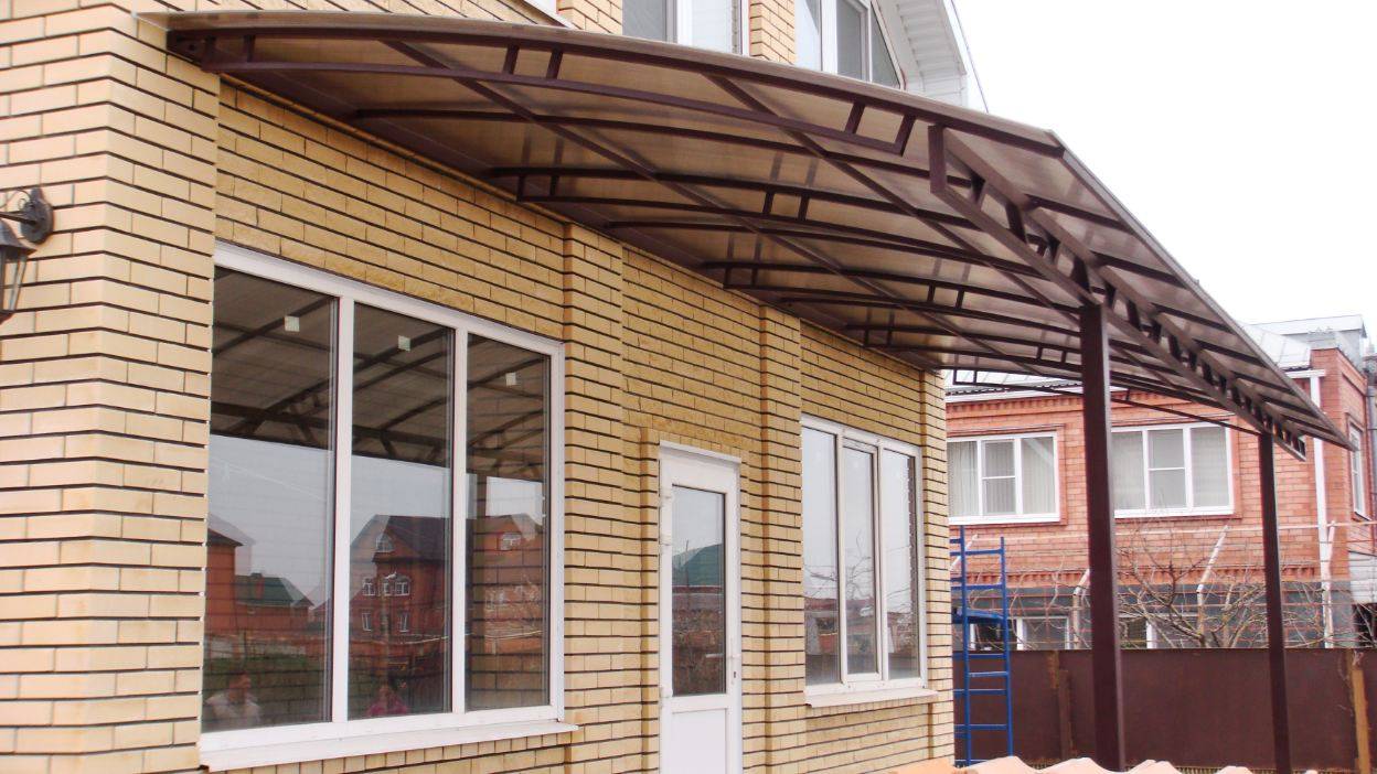 Со стороны фасада навес часто делают арочным. В этом случае радиус изгиба сотового поликарбоната должен быть равен высоте пристроя.