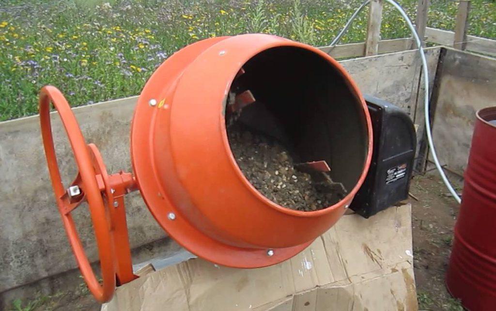 Если требуется приготовить большое количество раствора, целесообразно использовать бетономешалку. Оборудование можно купить или взять в аренду, процедура производства выглядит следующим образом:
