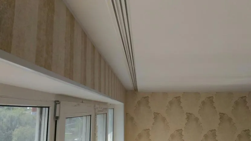 Скрытая установка карниза на натяжной потолок, подразумевает соблюдение следующих правил: Чтобы шторы не перетерлись о потолочный выступ оставляется отступ от поверхности стены шириной 150-200 мм. По ширине ниша должна соответствовать глубине складок на шторах
