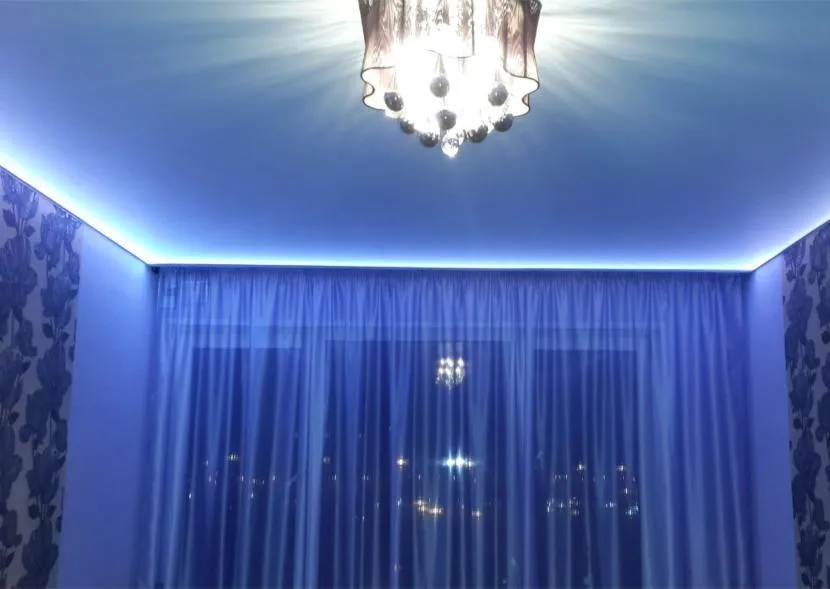 Чтобы сделать подсветку штор, в нишу со стороны комнаты клеится светодиодная лента. Если выбран вариант с профилем для двухуровневых потолков, приобретают багет со специальными углублениями.