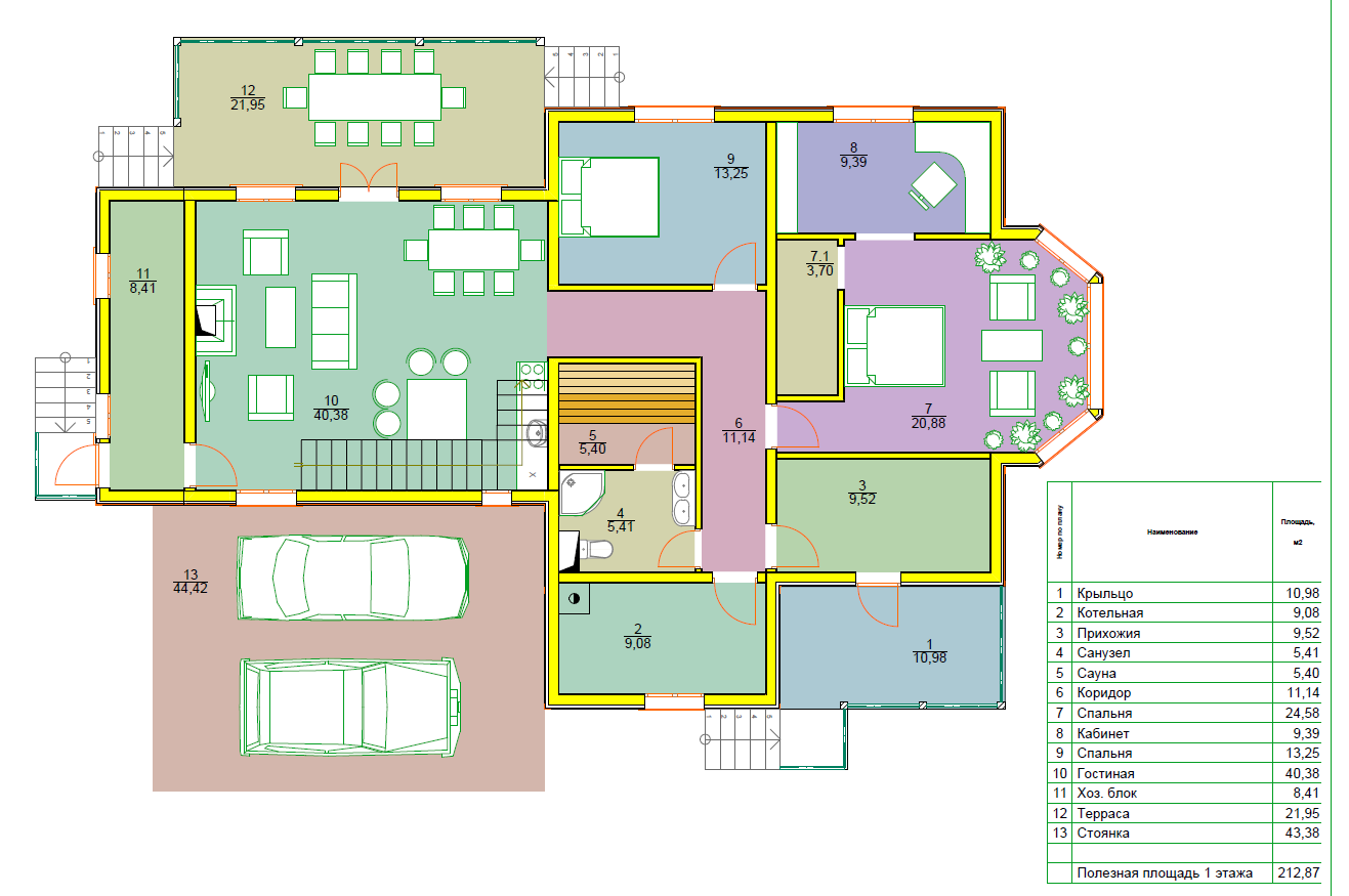 - спальня – эта комната в современном доме может быть совмещена с кабинетом или библиотекой; рядом удобно размещение гардеробной и санузла; кроме спальных мест, можно оборудовать зону для релакса, где поставить небольшой столик с удобными креслами; также не помешает платяной шкаф для одежды, оборудованное место со столом и зеркалом для снятия макияжа; помещение устраивают подальше от входа в строение, с ориентацией окон на юго-запад, чтобы при просыпании утром не беспокоили прямые солнечные лучи;