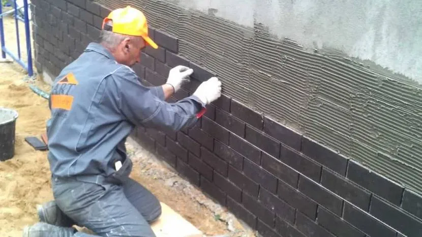Для тщательного замешивания используют миксер. Клеевую смесь наносят на всю поверхность плиток. Аккуратно камень прикладывают к стене. Аккуратно удаляют остатки клея между швами плиток. Если укладка подразумевает наличие швов, то между плитками устанавливают специальные маячки. А после полного высыхания швы затирают специальным раствором и узким шпателем. После завершения укладки и высыхания клея цоколь обрабатывают специальным раствором, который защитит его от воздействия внешней среды.