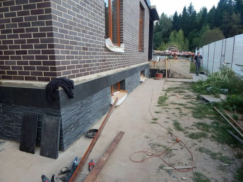 Некоторые отделочные материалы, например искусственный и натуральный камень, плитку, кирпич, перед облицовкой нужно обработать составами, отталкивающими воду – гидрофобизаторами. Обработка выполняется для защиты цоколя от проникновения влаги.