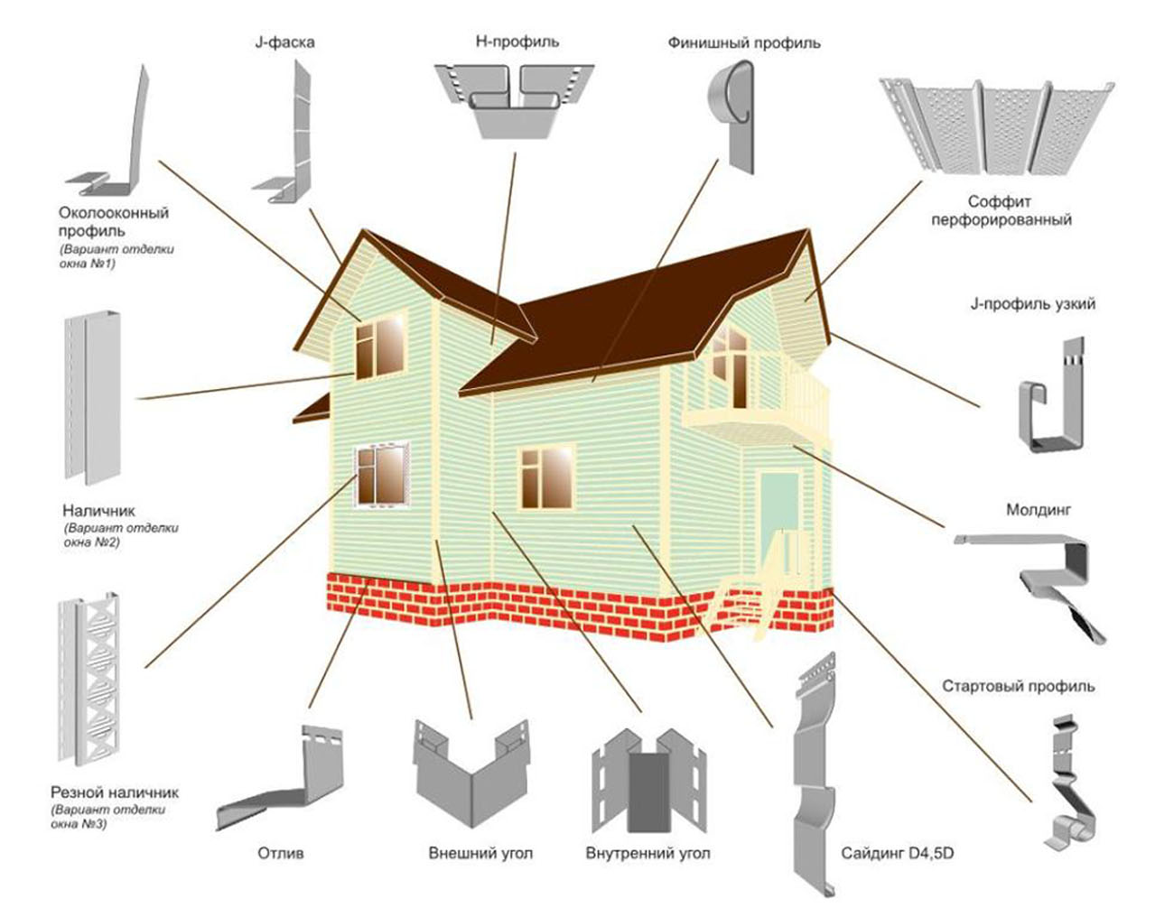 Для наружных работ и облицовки фасадов чаще всего используют сайдинг ПВХ, который разделяют на стеновой и цокольный. Материал для отделки надземной части фундамента отличается повышенной механической прочностью за счет дополнительной толщины. Технология изготовления позволяет выпускать пластиковый декор разных оттенков, поверхность которого имитирует натуральный камень, древесину любых пород или кирпичную кладку. В комплекте с панелями поставляют и дополнительные элементы, в том числе: