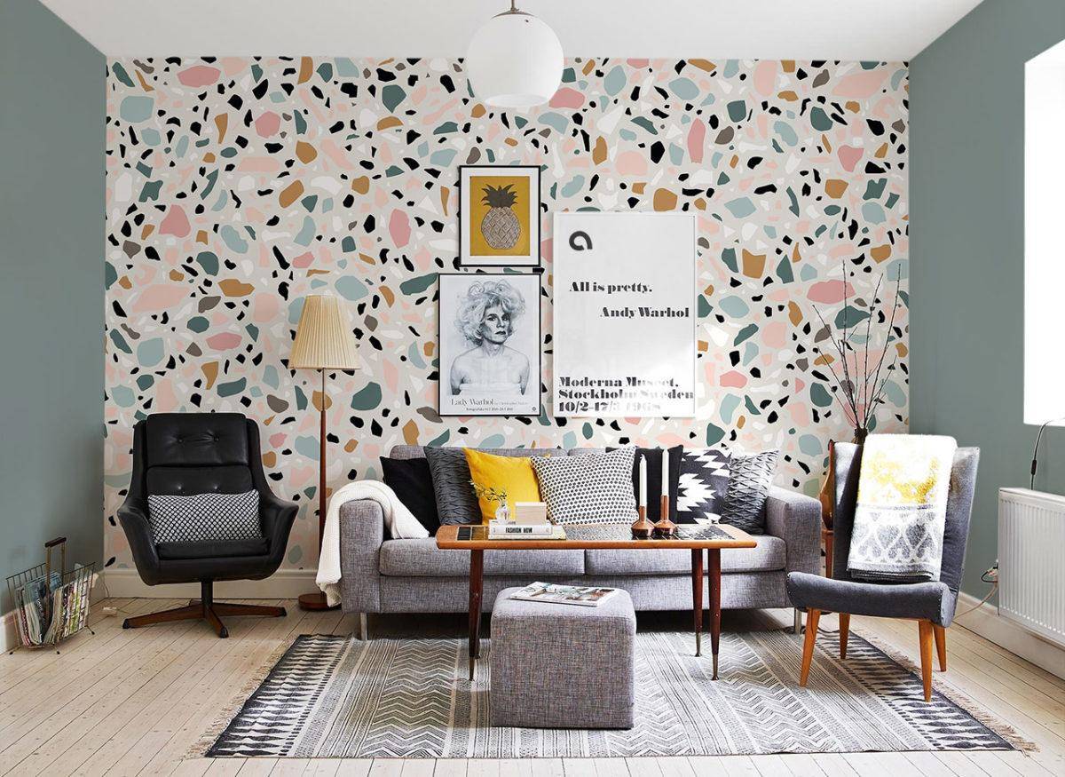 - Обои в технике Тераццо напоминают бетонные полы с вкраплениями цветного стекла и камня.