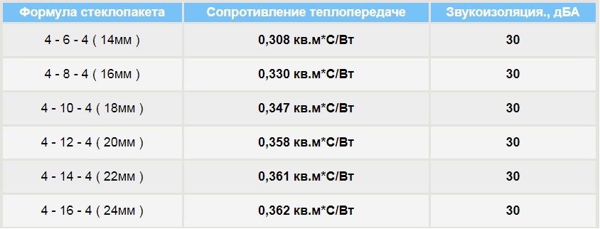 Основные характеристики стандартных однокамерных стеклопакетов с различными формулами представлены в размещенной ниже таблице. Как видите, при высшем качестве стекол букву «М» вообще не указывают в формулах.