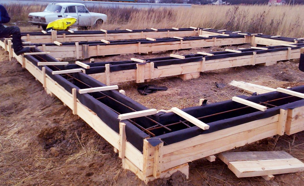 - опалубка – нижняя палуба опирается на колышки с поперечинами, боковые щиты крепятся к ней, стягиваются шпильками или деревянными перемычками, внутренняя поверхность обычно обшивается пленкой или рубероидом;