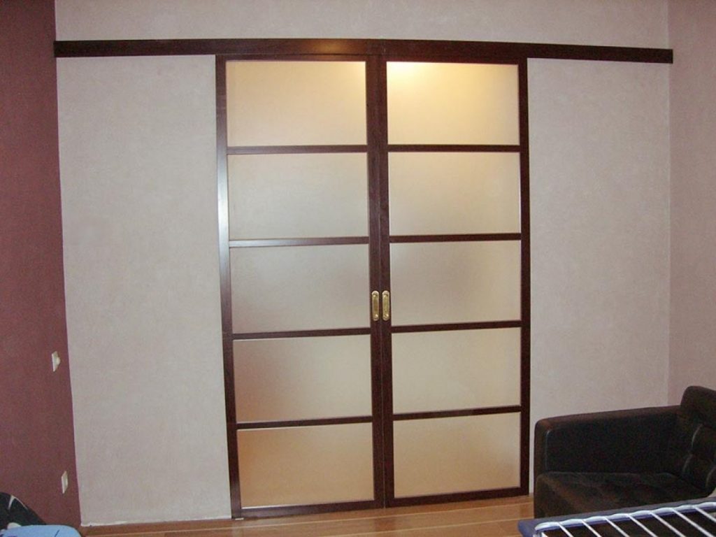 В зависимости от ширины проема устанавливаются одно- или двустворчатые двери. Первые целесообразно применять тогда, когда проем имеет небольшие размеры. Вполне достаточно одного полотна, которое при открывании передвигают в одном направлении.