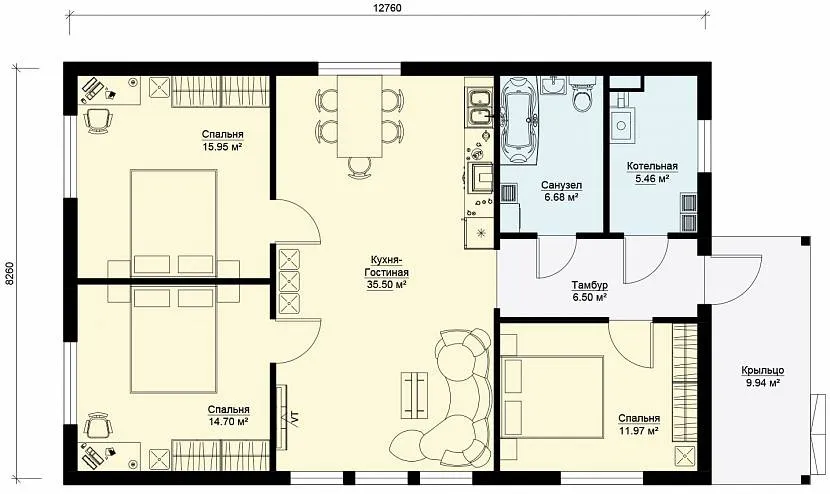Отсутствие переходов с одного этажа на другой, расположение всех помещений, включая «удобства», на одном уровне – это большой плюс, особенно для детей, пожилых и маломобильных людей.