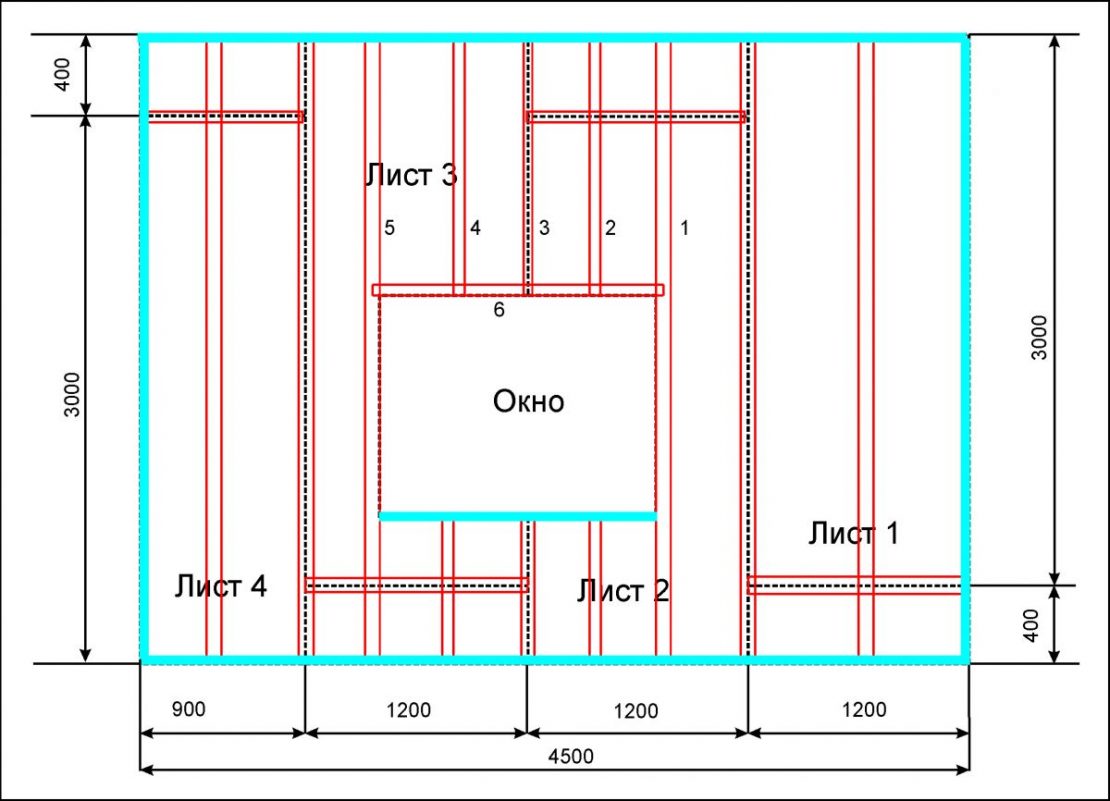 При прикреплении листов первоначально выполняться монтаж от стены. Второй лист выполняется относительно самого первого продольного профиля. Расстояние, которое образовалось между продольным профилем и стеной, закрывается. Для этого используется половина листа.