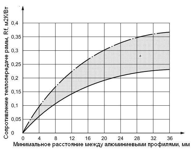 Заштрихованная область на рисунке 7 выше сплошной линии соответствует величинам сопротивления теплопередаче рамы, полученным для различных алюминиевых окон при различных условиях в различных европейских странах. Поэтому верхнюю линию надо понимать как практический максимум сопротивления теплопередаче алюминиевых рам для заданных величин терморазрыва d.