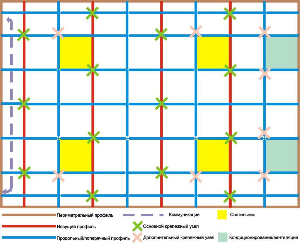 - Если на некоторые участки потолка предусмотрена дополнительная нагрузка, например, размещение светильников, то усильте близлежащие каркасные профили дополнительными подвесами.