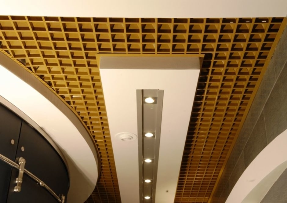 - Практичность проявляется в возможности создания уникального по формату дизайна потолка. Решетчатые подвесные потолки отлично комбинируются с другими видами отделки, будь то гипсокартонная конструкция или кассетные потолки. Наиболее распространены одноуровневые потолки Грильято, но в то же время многоуровневые конструкции с использованием модулей разных цветов и различных видов освещения способны значительно разнообразить интерьер.