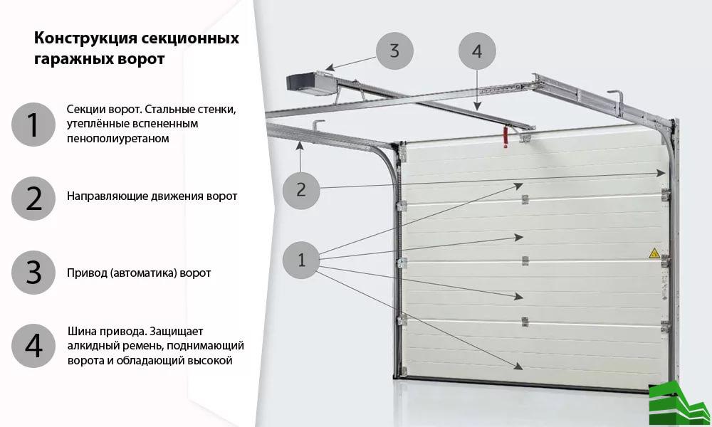 Конструкция гаражных секционных ворот состоит из ламелей, скрепленных между собой в единое полотно, и механизма, состоящего из направляющих, пружинных блоков для уравновешивания полотна во время движения, и подъемно-торсионной системы, обеспечивающей движение полотна вдоль направляющих за счет системы тросов, валов и барабанов.