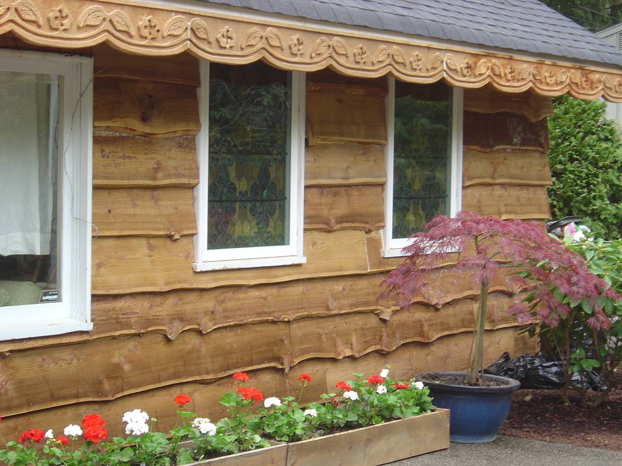 Еще одним оригинальным решением является наружная отделка стен необрезной доской. Ее принцип напоминает монтаж обычного деревянного сайдинга, когда доски крепятся на стену «елочкой».
