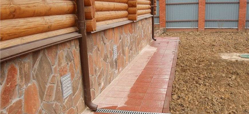 Плитка и брусчатка характеризуются высокой устойчивостью к перепадам температур и влаге. Эти материалы монтируют на предварительно залитое бетонное основание. При формировании защитной «ленты» вокруг фундамента нужно герметизировать швы между плиткой.