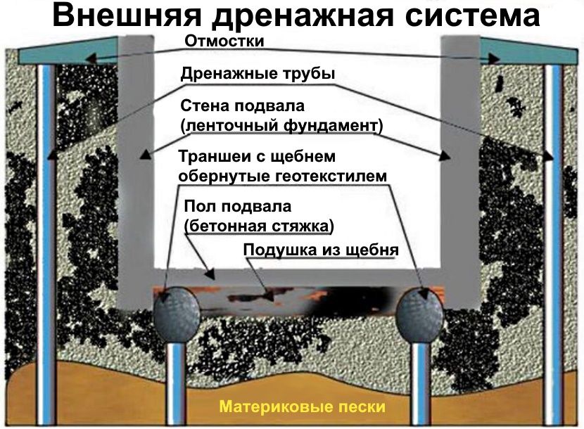 Отведение подземных вод осуществляется тремя дренажными системами, выбор которых зависит от геологии участка: