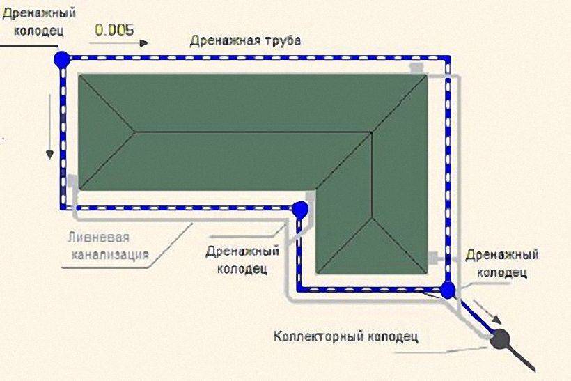Отвод от основания талых и ливневых вод выполняет кольцевой дренаж. Такое водоотведение предполагает траншеи с трубами, направляемыми в канализацию.