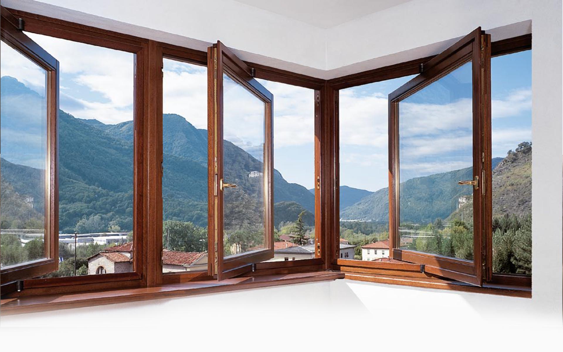 - Дерево. Самые дорогие и сложные в уходе конструкции. Для изготовления изделий чаще всего используют лиственницу, сосну или дуб. Деревянные конструкции свободно пропускают воздух даже в закрытом положении. Все это благодаря пористой структуре древесины. Еще одним безусловным преимуществом деревянных изделий является их презентабельный и дорогой внешний вид. Поскольку дерево — это натуральный материал, стоят такие окна гораздо дороже. Эксплуатация их тоже намного сложнее, чем пластиковых или алюминиевых изделий, поскольку дерево может гнить, разбухать от воды. Чтобы этого не произошло, необходимо покрывать их лаком, приобретать специальные средства по уходу.