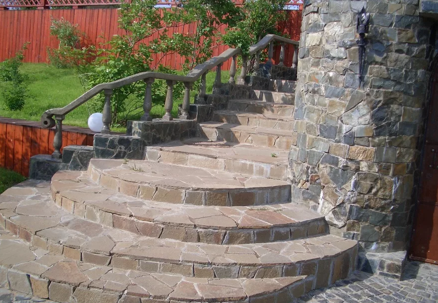 Природный камень – гранит, мрамор, кварц. По прочности из всего многообразия материалов первое место занимает гранит. Входная группа из камня отлично смотрится в классическом и современном дизайне. В деревенский стиль хорошо впишется крыльцо, отделанное бутовым камнем.