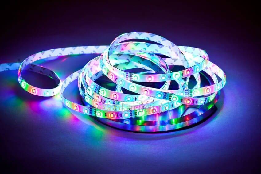 Многоцветные RGB ленты могут менять освещение из–за нескольких разных светодиодов в конструкции: красного, зеленого, синего цвета. Регулирую интенсивность отдельного света контроллером, можно выбрать нужный оттенок. Некоторые модели контроллеров могут автоматически менять цвета, которые будут зависеть от желаний жильца.