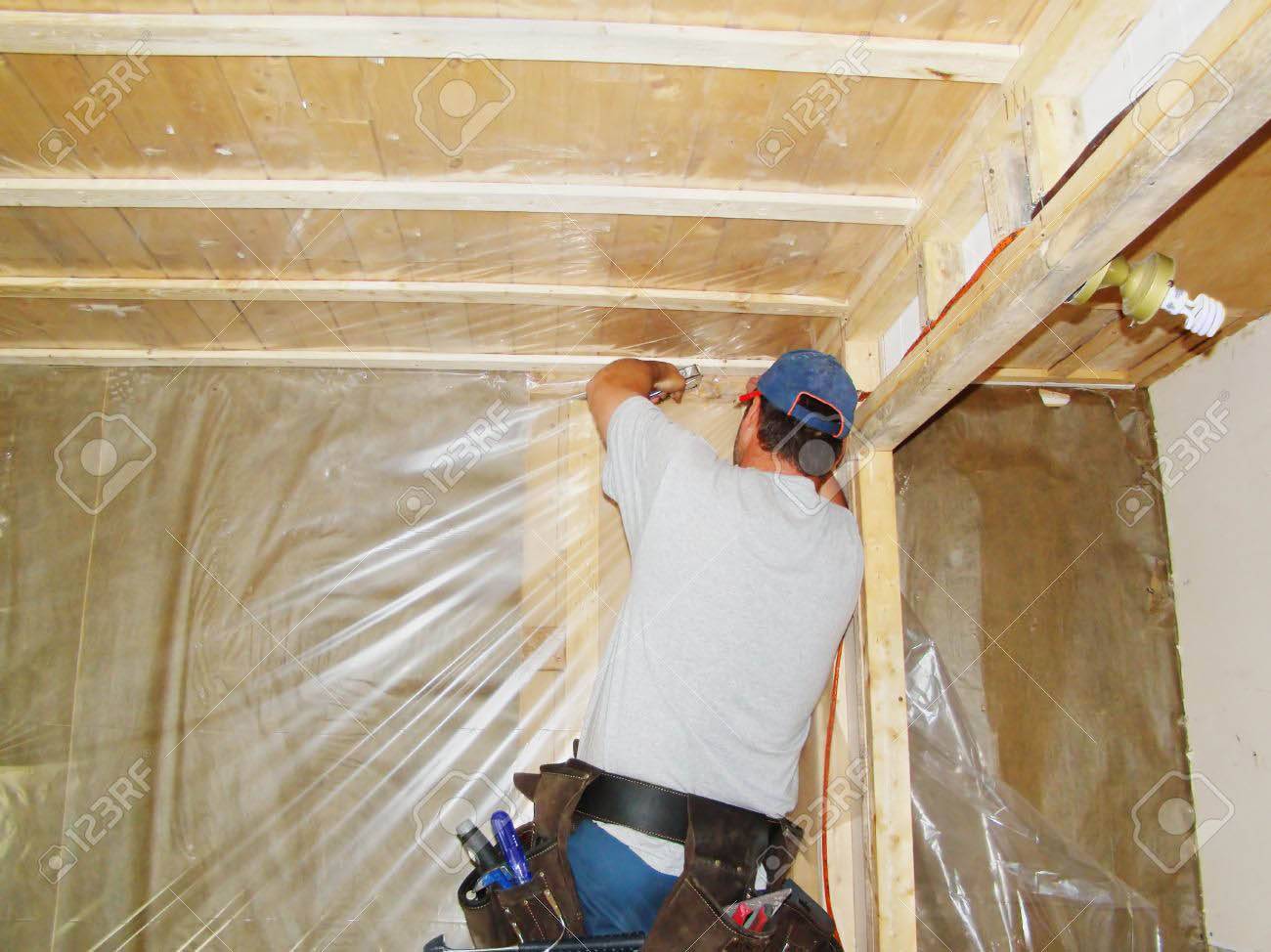 - Развертывание пленки и ее крепление к балкам перекрытия при помощи строительного степлера.