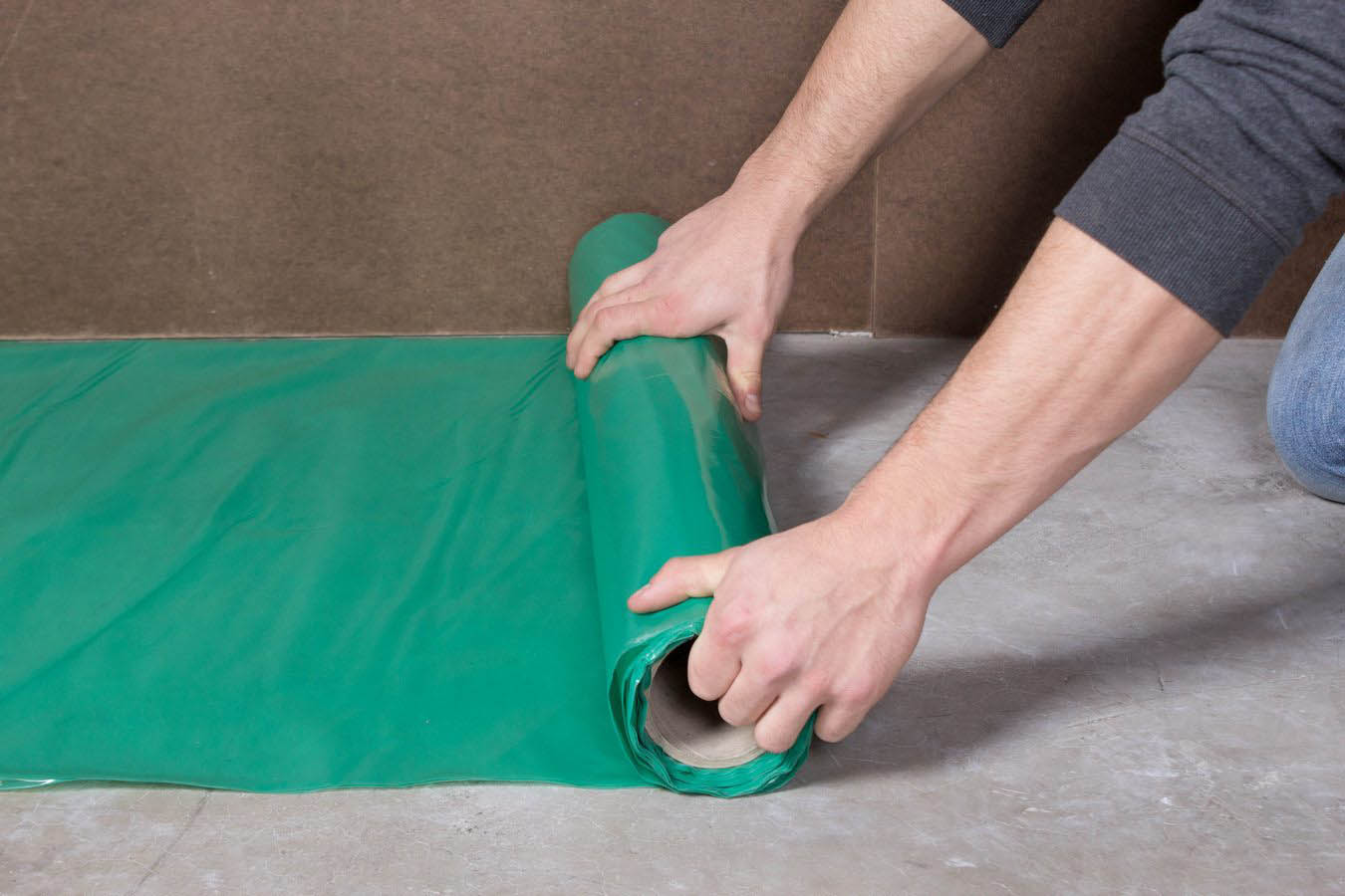Мужчина укладывает пароизоляционный материал на пол