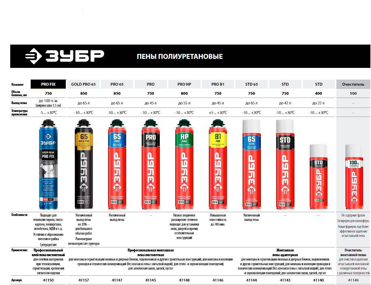 Расход . Параметр измеряется в литрах. Некоторые пены имеют большое расширение до 65 л с баллона 1 л, другие – до 30 л. На степень расширения может повлиять температура окружающей среды, технология нанесения.