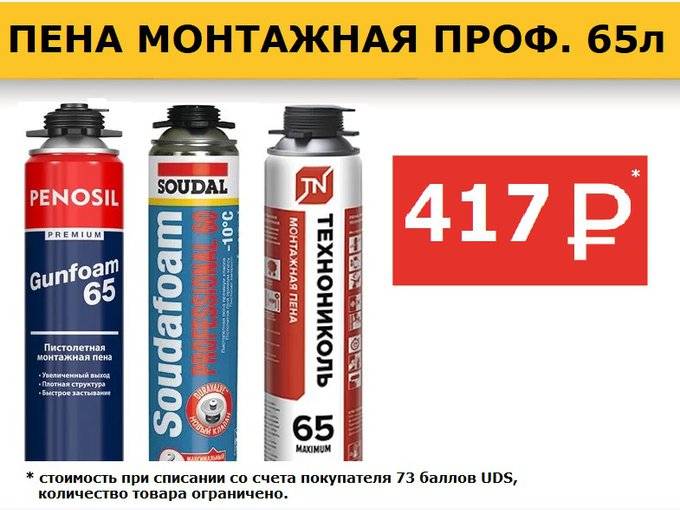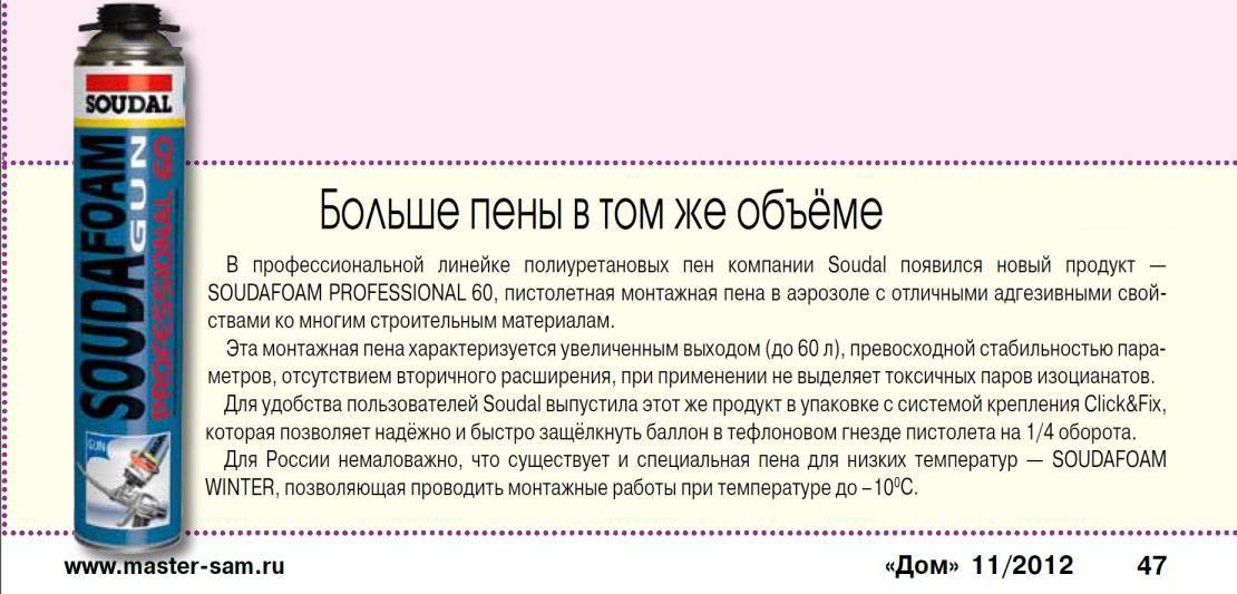 | Соудал (Soudal) | 192–396 руб. | Качественный продукт, выпускается в нескольких вариантах — зимняя, летняя и огнестойкая. Не токсична, с маловыраженным запахом. Мелкопористая, безусадочная | Не везде продается. Не любит солнечного света (впрочем, как и большинство пены) — меняет цвет и крошится. Требует дополнительного покрытия краской |