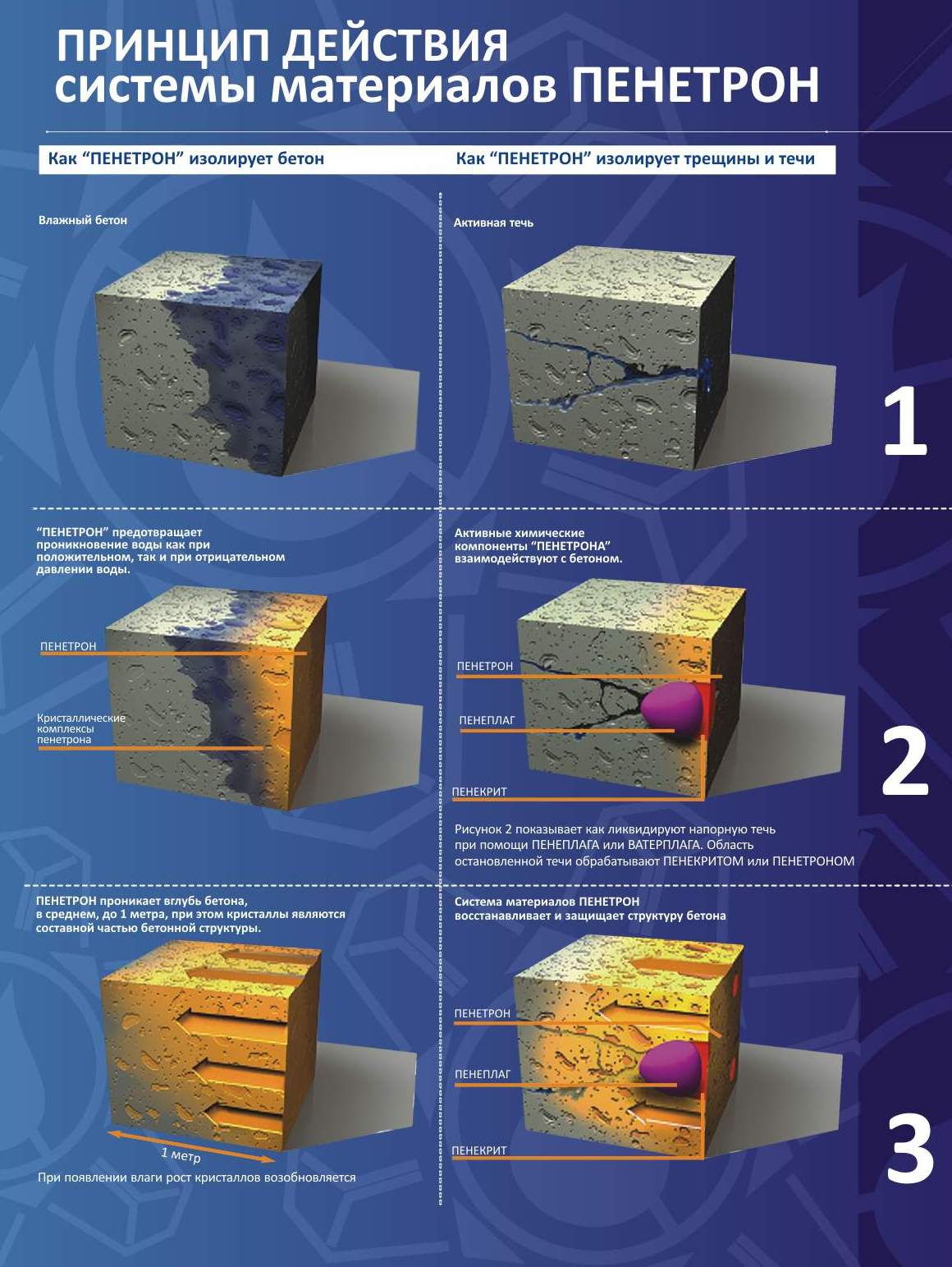 При нанесении на влажный бетон жидкого раствора материала Пенетрон на поверхности создается высокий химический потенциал, при этом внутренняя структура бетона сохраняет низкий химический потенциал. Осмос стремится выровнять разницу потенциалов; возникает осмотическое давление. Благодаря наличию осмотического давления активные химические компоненты материала «Пенетрон» мигрируют глубоко в структуру бетона. Чем выше влажность бетонной структуры, тем эффективнее происходит процесс проникновения активных химических компонентов в глубь бетона. Этот процесс протекает как при положительном, так и при отрицательном давлении воды. Проникнув в глубь структуры бетона, активные химические компоненты материала «Пенетрон», растворяясь в воде, вступают в реакцию с ионными комплексами кальция и алюминия, оксидами и солями металлов, содержащимися в бетоне. В ходе этих реакций формируются более сложные соли, способные взаимодействовать с водой и создавать нерастворимые кристаллогидраты. Сеть этих кристаллов заполняет поры, капилляры и микротрещины шириной до 0,4 мм. При этом кристаллы становятся составной частью бетонной структуры.