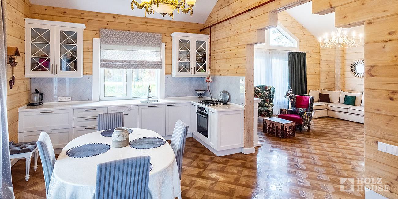 В кухне фальшбрус смотрится уместно всегда. Можно отделать только стены, только потолок или полностью всю кухню – решать только хозяевам квартиры. Если на одной из стен располагается кухонный гарнитур, тогда можно отделать панелями три другие. А можно выделить при помощи имитированного бруса одну стену или угол, оборудовав там обеденную зону. Если кухня небольшая, отделку нужно располагать горизонтально, выбирая широкие панели.