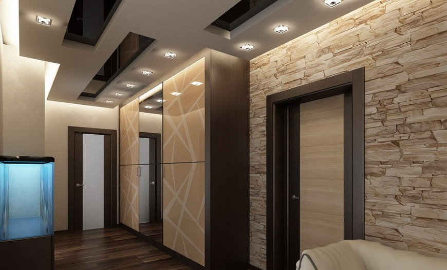 К универсальным вариантам для отделки пола относят керамическую плитку. Материал считается долговечным и эстетически привлекательным. Кроме того, пол можно устелить паркетом, линолеумом и ламинатом. В коридоре также совмещают несколько вариантов: участок у входа отделывают плиткой, а отдаленные углы закрывают ковром.