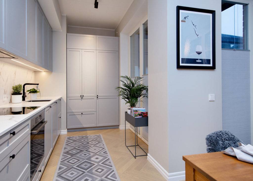 Тогда кухня в коридоре также будет выгодным решением, которое сэкономит пространство. Мы обычно используем кухонные шкафы в таких проектах. Они практичны, потому что многое в них можно спрятать.