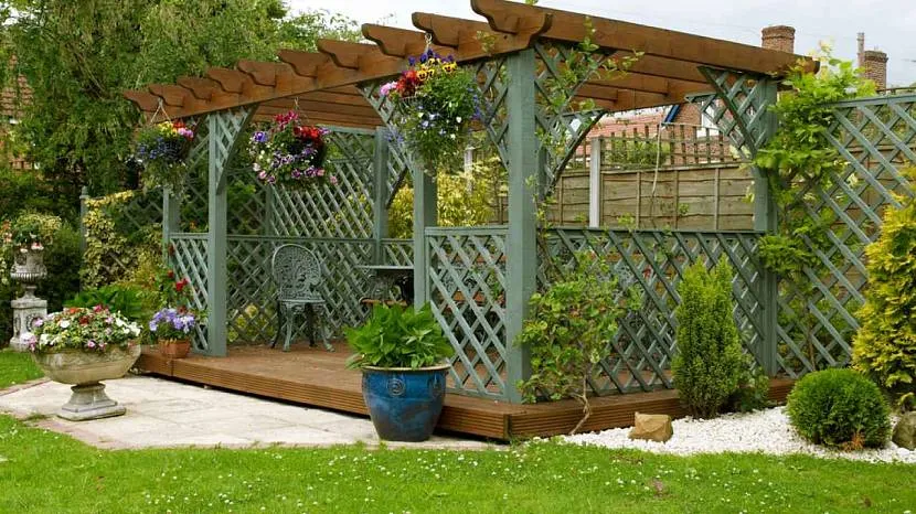 Пергола-беседка. Выполняет все функции беседки, но отличается от последней тем, что пергола укроет от солнца, но не защитит от дождя, поскольку ее крыша решетчатая.