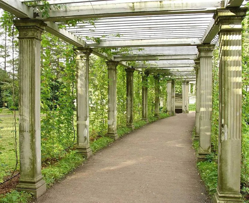 Через некоторое время элемент архитектуры стал частью ландшафтного дизайна. Внешний вид навеса и его функциональность изменились, но при этом остались самые главные черты – перекрытие из решеток, колонны для опор и одинаковые секции.
