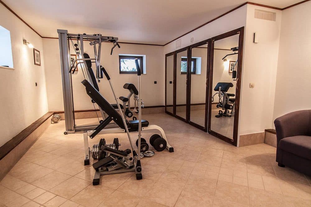 - Проект коттеджа с цоколем 10 на 10 можно разнообразить обустройством спортзала;
