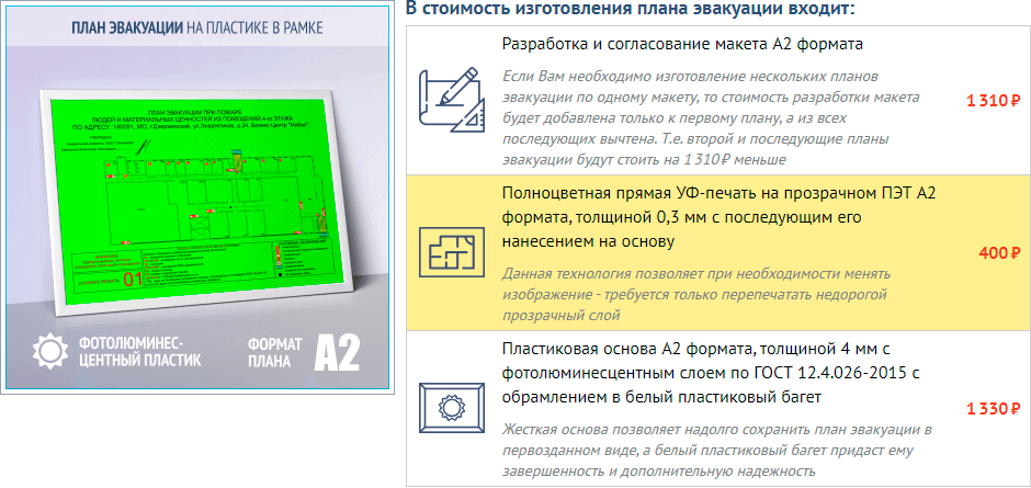 | 2 | Переделка ранее изготовленного фотолюминесцентного плана эвакуации А2 формата в пластиковой рамке в связи с необходимостью доработки макета (например, при изменении экспликации помещений) | В данном случае для вашей экономии мы можем использовать ранее изготовленную основу, поэтому вы получаете счет: Разработка макета плана эвакуации (А2 формат) – 1 шт.Печать плана эвакуации на прозрачном ПЭТ формата А3 – 1 шт. |