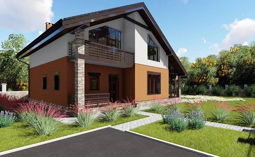 Дом со вторым этажом мансардного типа, построенный в стиле шале. Планировка просторного первого этажа полностью отдана под так называемые нежилые помещения и гостиную, площадью 26,78 м2. На входе гостей встречает небольшая прихожая с дверью в кладовую, чуть дальше санузел и рабочий кабинет главы семейства. В отсутствии необходимости такого помещения допускается перепланировка под другие цели, например, детская игровая комната, просторная гардеробная или что-то иное.