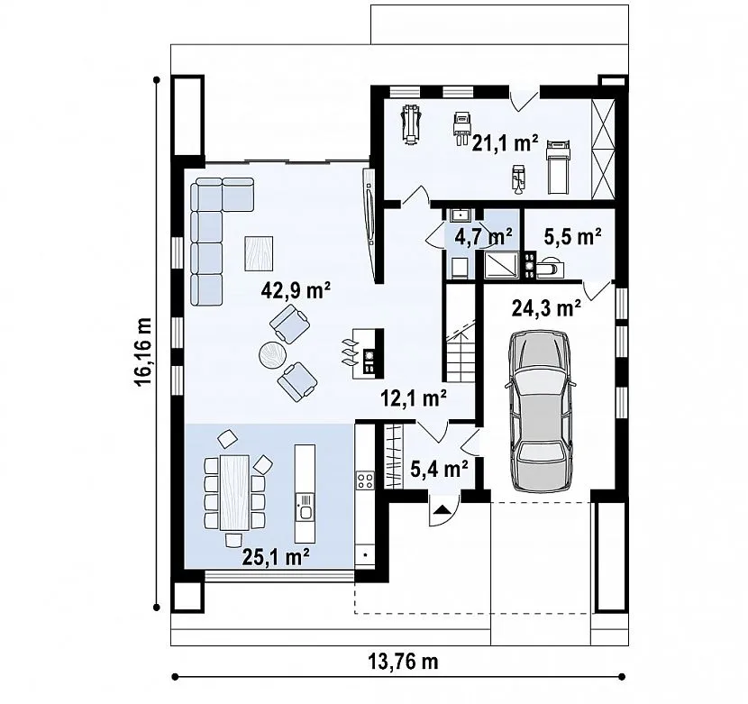 Лаконичный коттедж эконом-класса, укомплектованный всем необходимым для комфортного проживания семьи из четырёх человек. Планировка первого этажа показывает наличие просторной гостиной, расположенной в заднем крыле дома. Помещение объединено с кухонной рабочей зоной и столовой. Строгая прямоугольная форма станет причиной зонирования большого зала на несколько частей. Делать это придётся внутренними элементами отделки (обоями, кафелем, мебелью). Небольшое пространство совмещённого санузла (4,4 м2) станет проблемой для монтажа ванной. Владелец будет вынужден решать между душевой кабинкой или уголком.