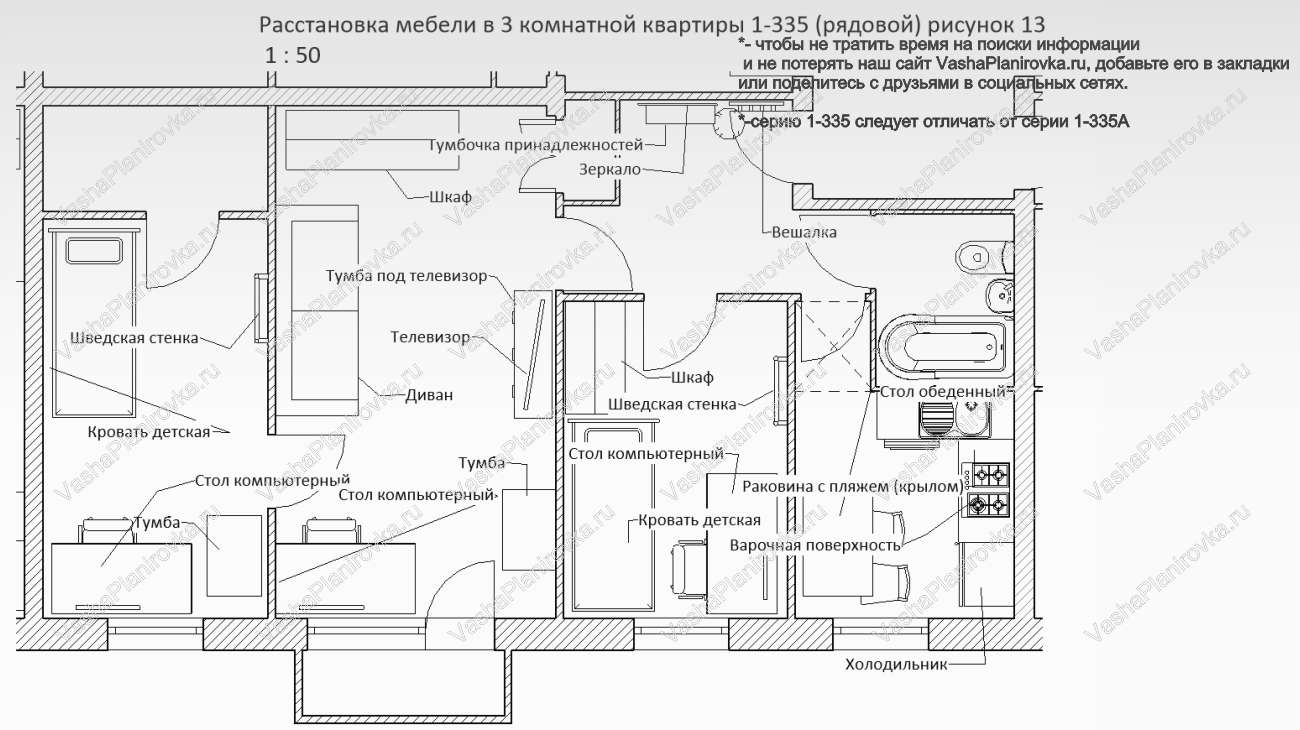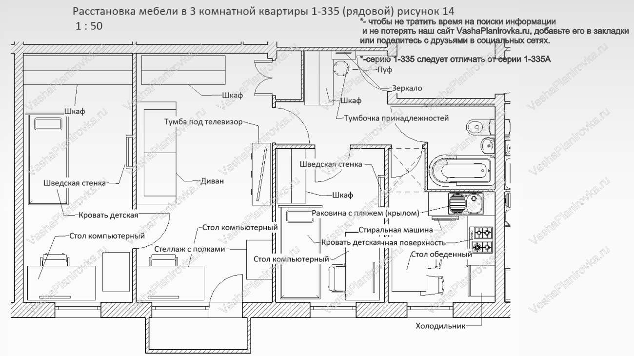 i 335 й серии размещение мебели в 3 х комнатной квартире (в центре)