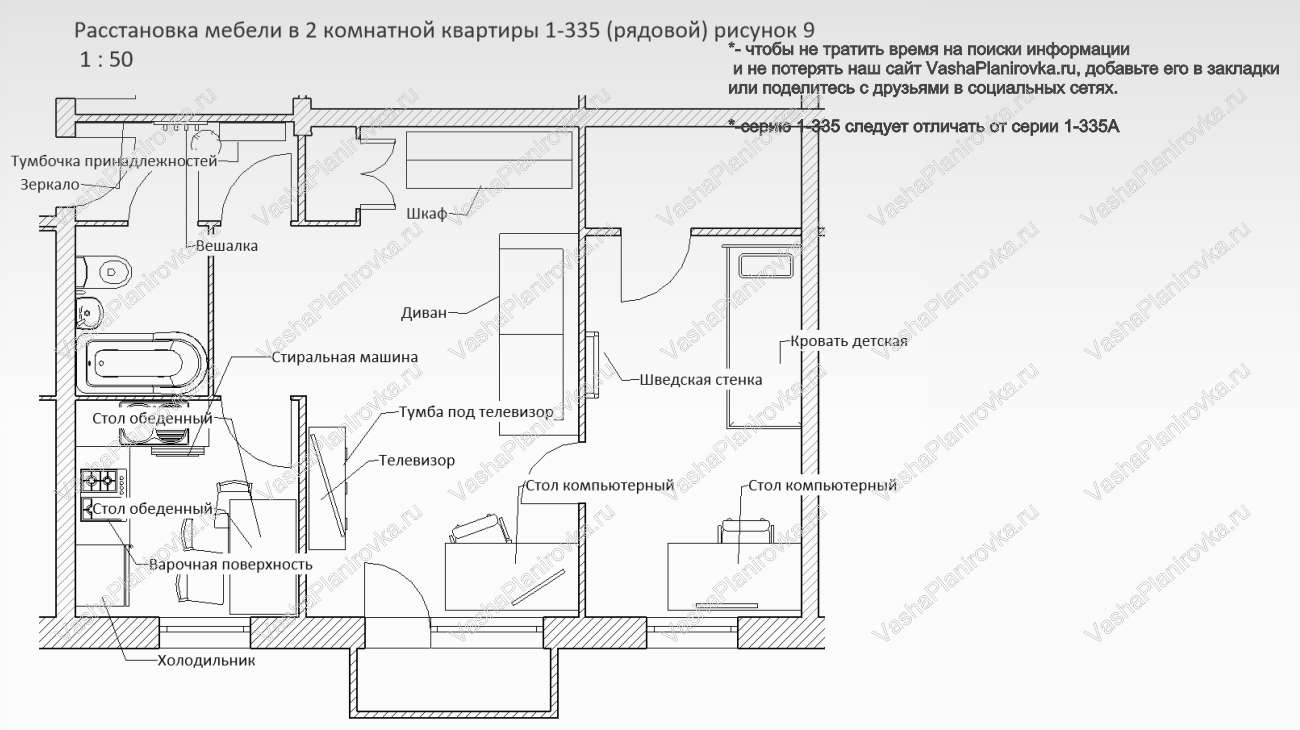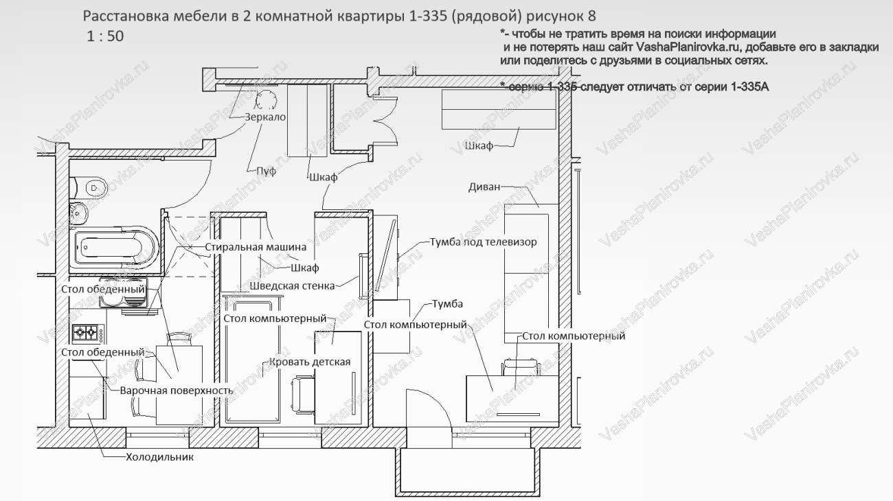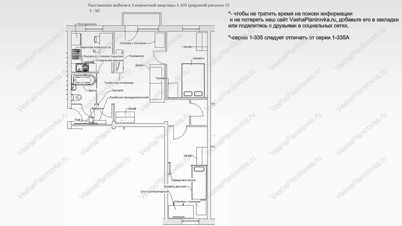 Как поставить мебель на схеме квартиры i335 можно посмотреть на чертежах ниже.